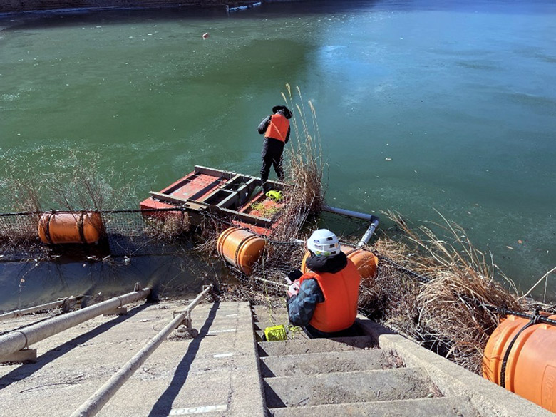初日は、追加依頼をいただいた水中ドローンによる撮影です。 水位低下によって露出が懸念される第5水門付近を重点的に調査しました。