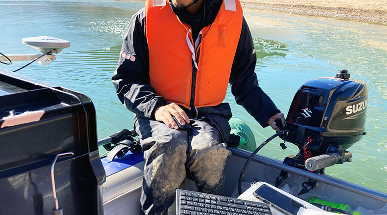 不安定なボートに乗りながら氷を除去するのはとても困難な作業。適切な計測環境を整えるまでに半日を要しましたが、正確なデータを取得するためには妥協できない工程です。