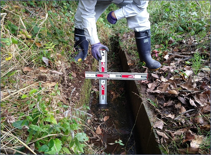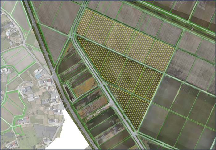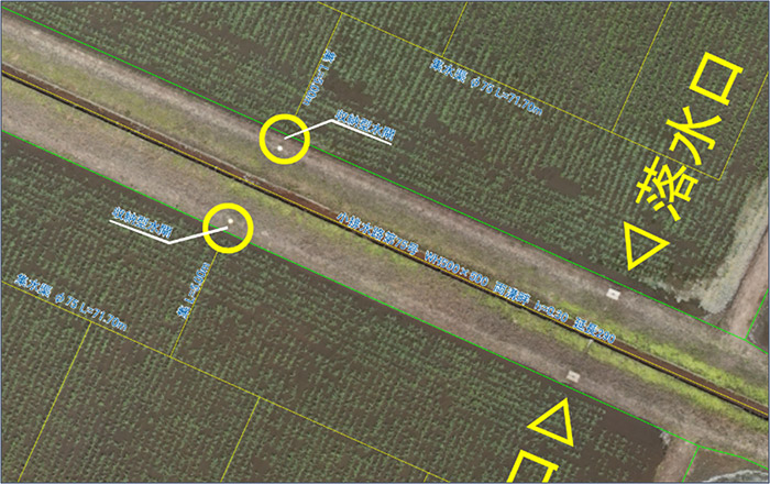 オルソ上で収納型水閘・落水口などがはっきり見えているため、位置や箇所数が特定できる。