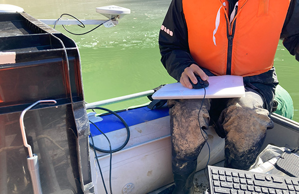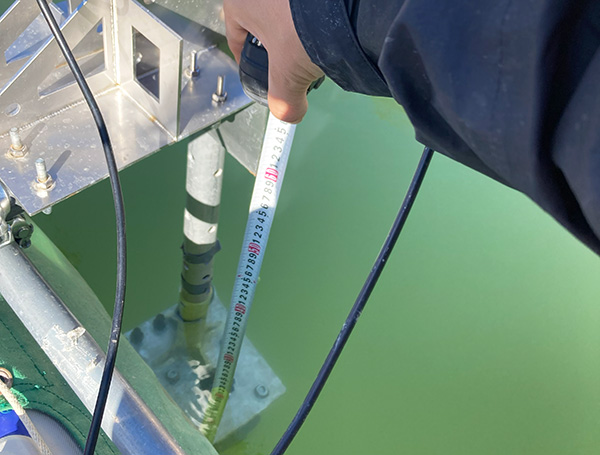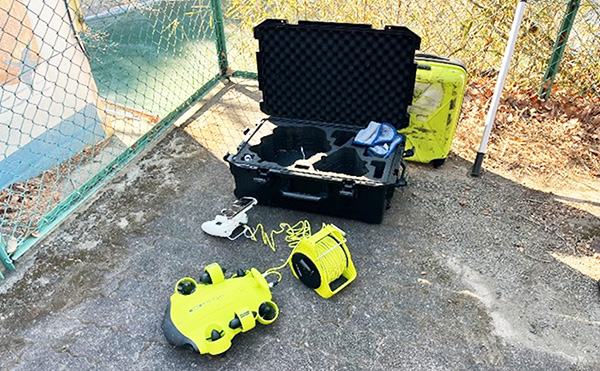 計測2日前に「水門開放の判断材料として水中を撮影してほしい」との追加要望をいただき、急遽水中ドローンを投入。水位低下に伴う水門の状態を動画撮影いたしました。